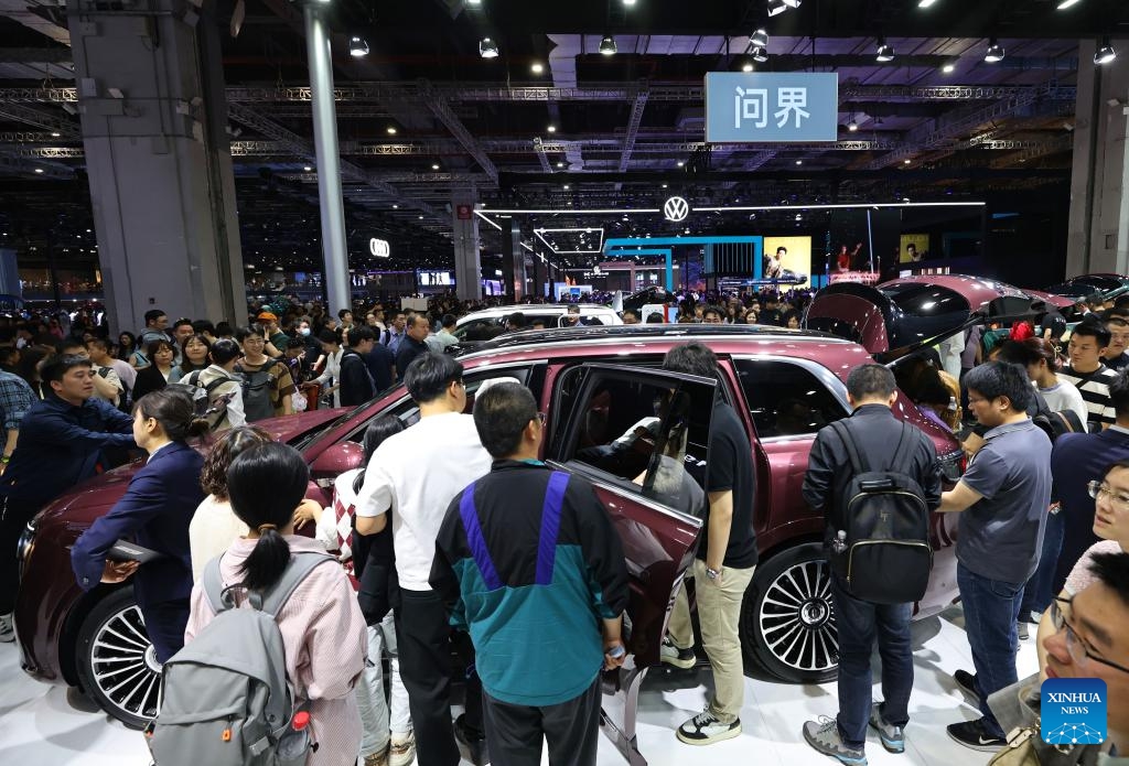 Besucher sehen sich ein AITO M9 an. (26. April 2025, Xinhua)