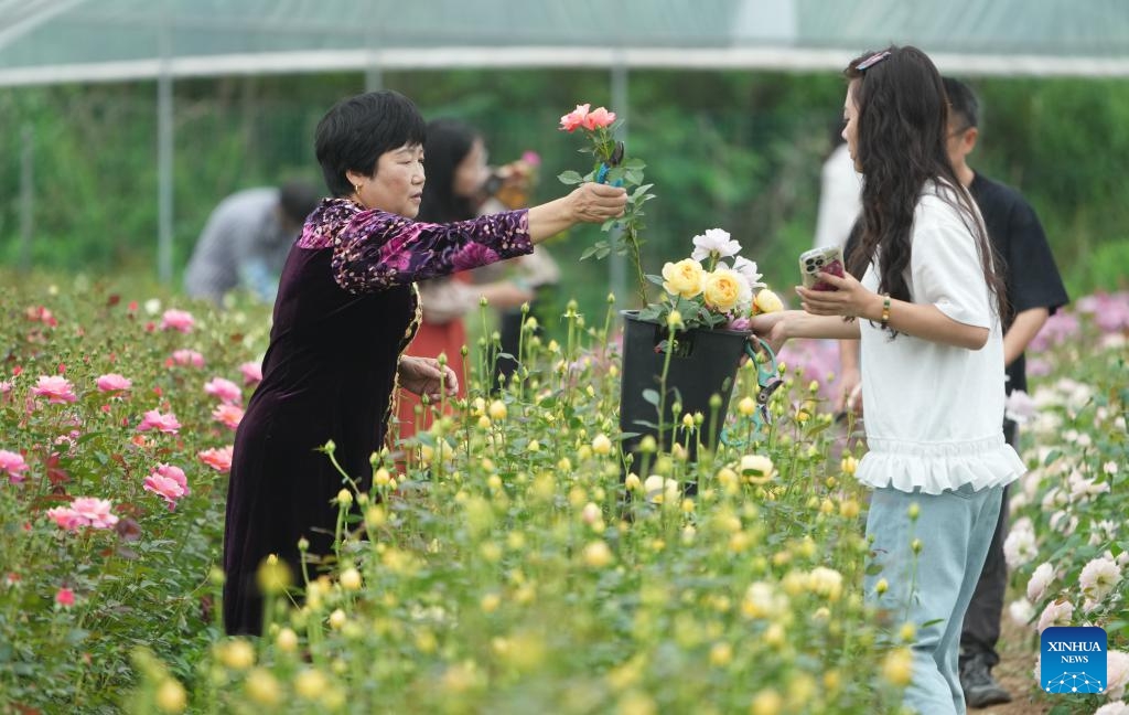 Besucher pflücken chinesische Rosen in einem Garten in Longyou. (22. April 2025, Xinhua)