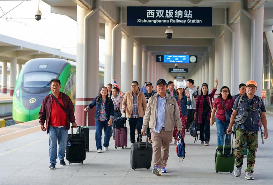 Touristen aus Laos und Thailand kommen am 18. Februar 2025 am Bahnhof von Xishuangbanna in der Stadt Jinghong in der Autonomen Präfektur Xishuangbanna Dai in der südwestchinesischen Provinz Yunnan an. (Xinhua/Chen Xinbo)