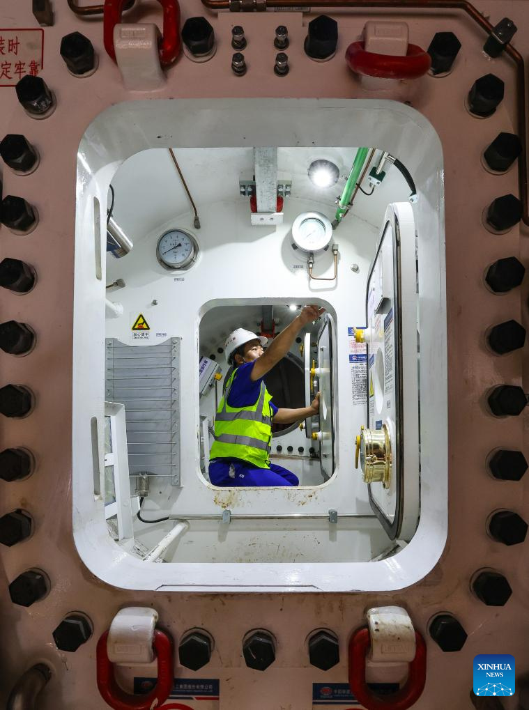 Ein Techniker überprüft die Schildvortriebsmaschine vor Arbeitsbeginn. (Foto vom 28. April 2025, Xinhua/Liu Dawei)