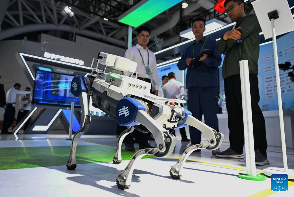 Ein Mitarbeiter steuert einen Roboterhund im Erlebnisbereich des 8. Digital China Summit in Fuzhou in der Provinz Fujian. (Foto vom 28. April 2025, Xinhua/Lin Shanchuan)