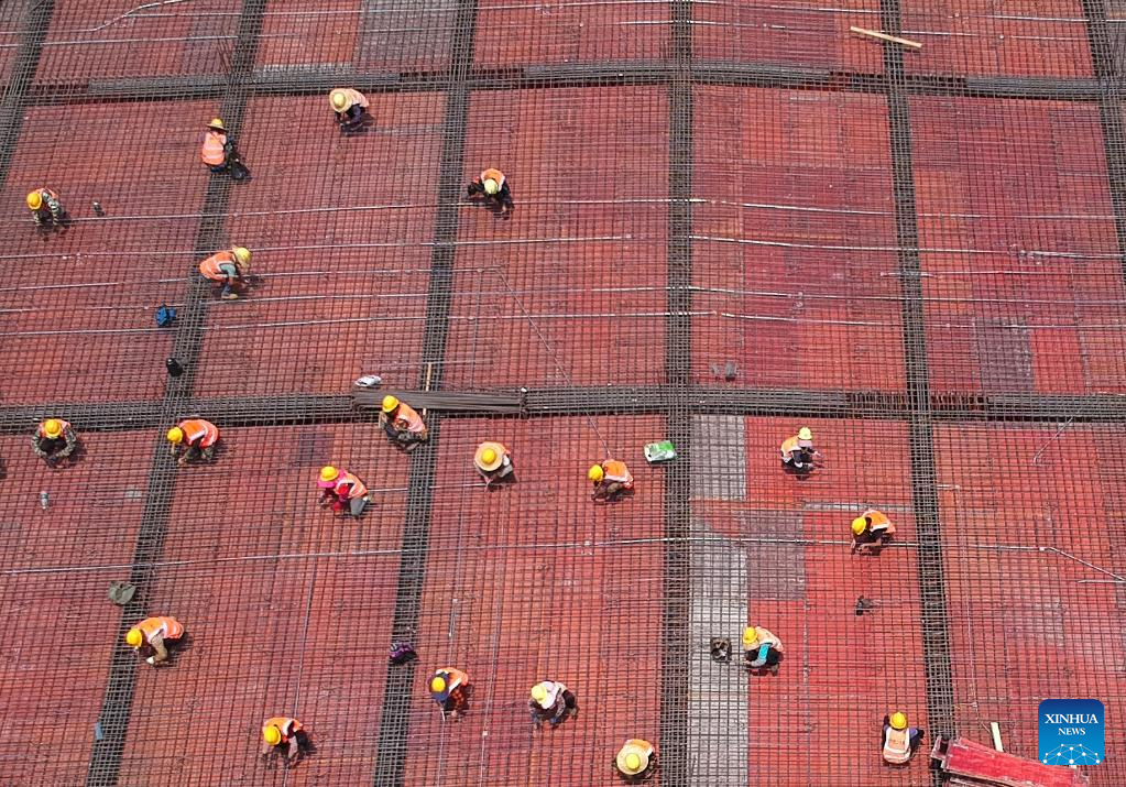 Die Drohnen-Luftaufnahme zeigt Arbeiter beim Bau der touristischen Unterstützungseinrichtungen auf der Wuzhizhou-Insel in Sanya. (Foto vom 29. April 2025, Xinhua/Zhao Yingquan)