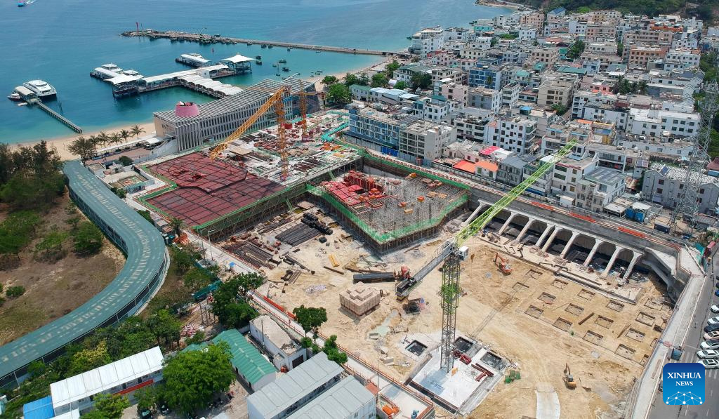 Die Drohnen-Luftaufnahme zeigt eine Baustelle für touristische Unterstützungseinrichtungen auf der Wuzhizhou-Insel. (Foto vom 29. April 2025, Xinhua/Zhao Yingquan)