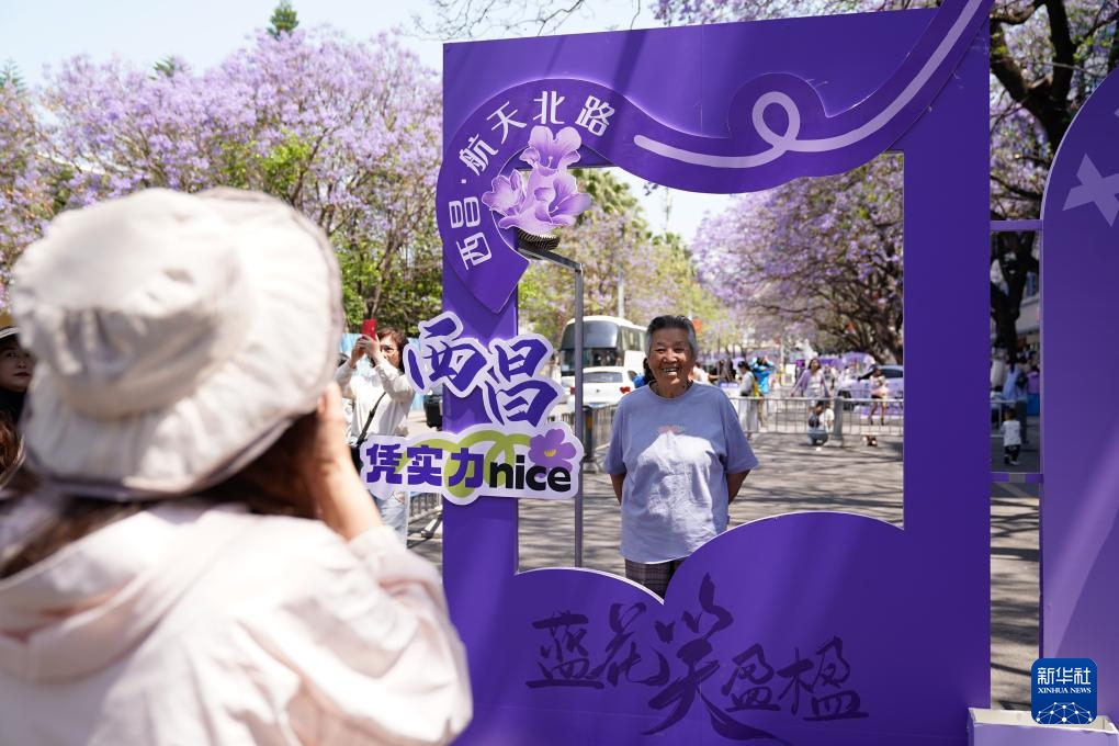Einwohner der Stadt Xichang machen Fotos unter blühenden Palisanderholzbäumen. (27. April 2025, Xinhua)