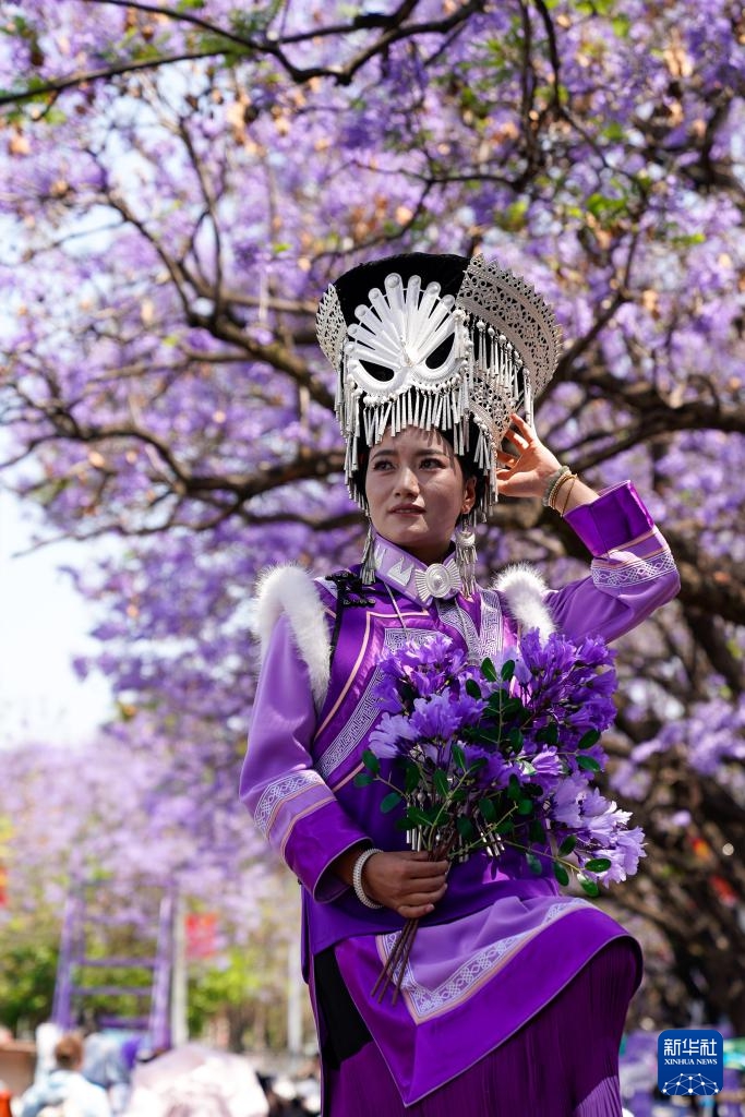 Einwohner der Stadt Xichang machen Fotos unter blühenden Palisanderholzbäumen. (27. April 2025, Xinhua)