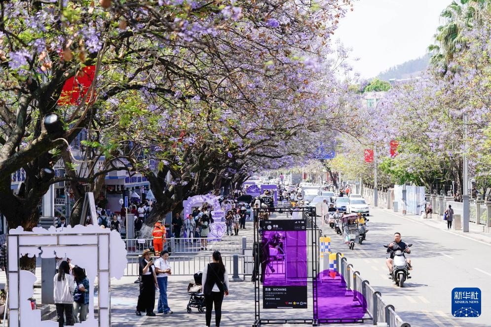 Einwohner der Stadt Xichang machen Fotos unter blühenden Palisanderholzbäumen. (27. April 2025, Xinhua)