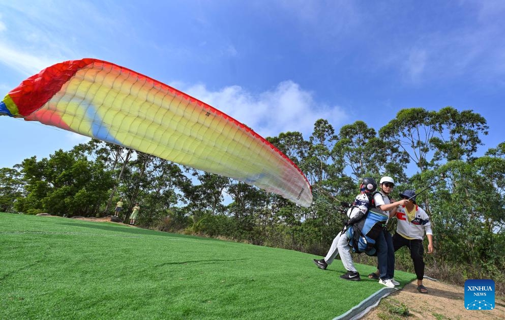 Ein Tourist probiert Gleitschirmfliegen im Kreis Lingshui in Hainan aus. (3. Mai 2025, Xinhua)