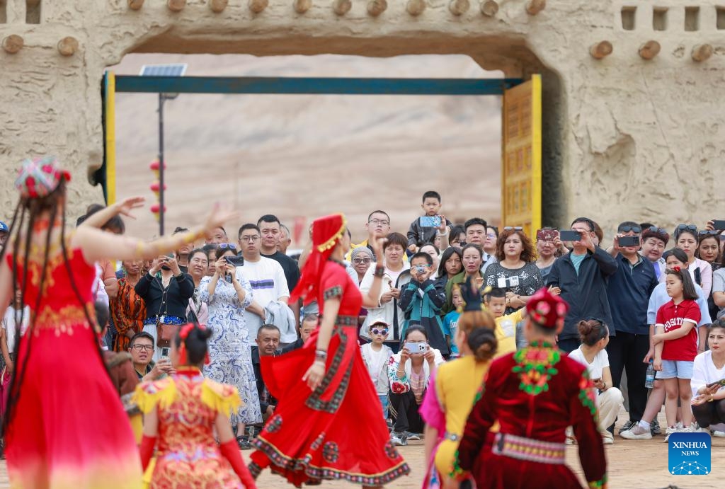Touristen sehen sich eine Volkskunstvorführung in Turpan in der nordwestchinesischen Uigurischen Autonomen Region Xinjiang an. (4. Mai 2025, Xinhua)