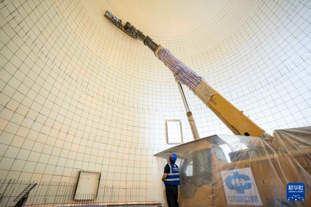 Arbeiter im Einsatz an der Wärmedämmschicht im Inneren eines Luftkissen-Getreidesilosim zentralen Getreidelager Changsha. (Foto vom 6. Mai 2025, Xinhua/Chen Sihan)