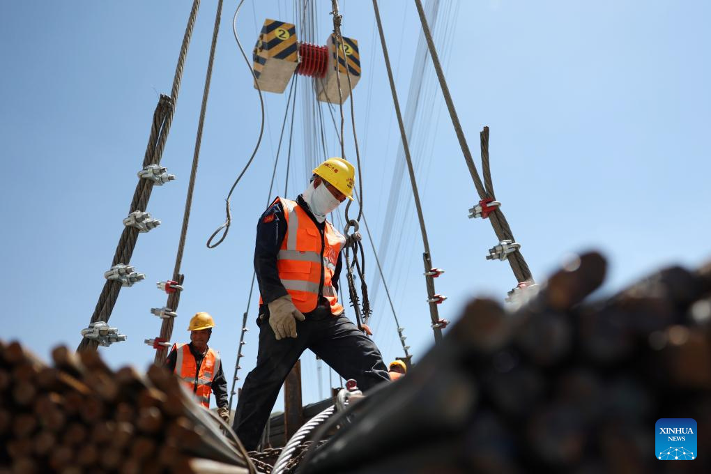 Arbeiter sind im Einsatz am Probelauf eines 500-Tonnen-Kabelhubsystems der Taohe-Brücke. (Foto vom 10. Mai 2025, Xinhua/Chen Bin)