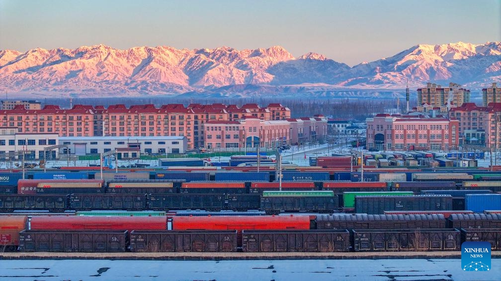 Ein Blick auf den Standard-Güterbahnhof des Horgos-Hafens in der nordwestchinesischen Uigurischen Autonomen Region Xinjiang. (25. Dezember 2024, Xinhua)