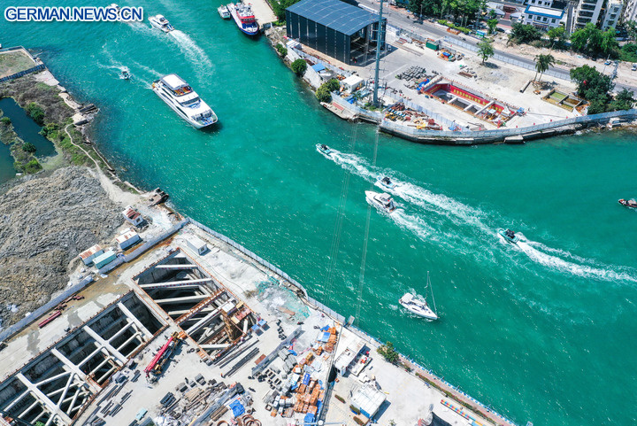 Die Drohnenluftaufnahme zeigt die Baustelle des Flussmündung-Durchgangsprojektes in Sanya in der südchinesischen Provinz Hainan. (Foto vom 5. Mai 2025, Xinhua/Zhao Yingquan)