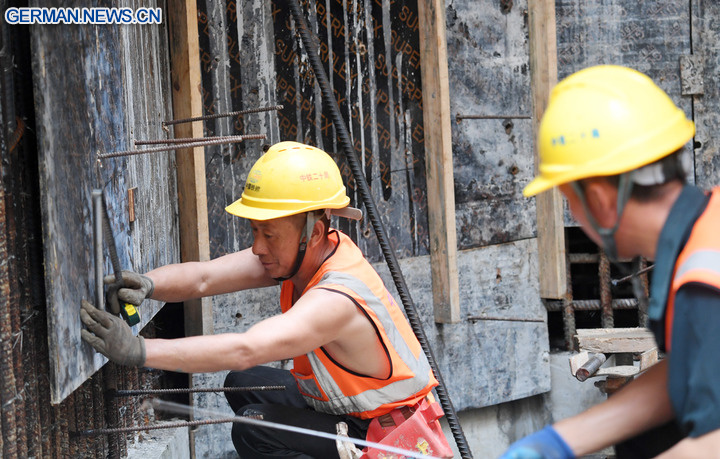 Arbeiter sind im Einsatz auf der Baustelle des Flussmündung-Durchgangsprojektes in Sanya in der südchinesischen Provinz Hainan. (Foto vom 5. Mai 2025, Xinhua/Zhao Yingquan)