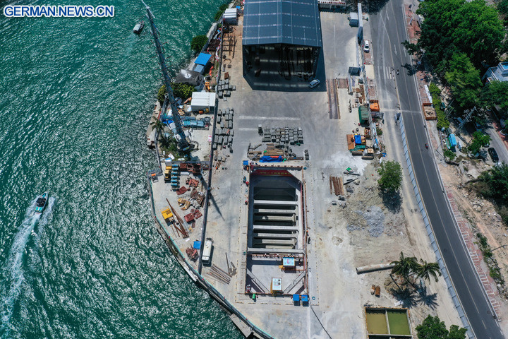 Die Drohnenluftaufnahme zeigt die Baustelle des Flussmündung-Durchgangsprojektes in Sanya in der südchinesischen Provinz Hainan. (Foto vom 5. Mai 2025, Xinhua/Zhao Yingquan)