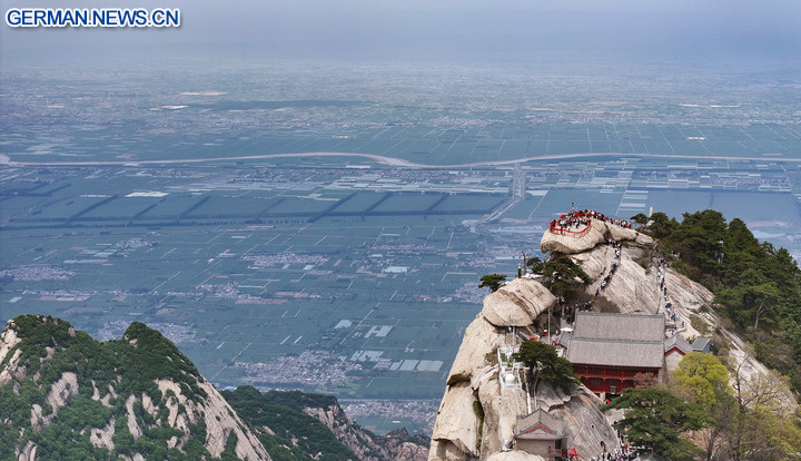 Die Luftaufnahme zeigt Touristen beim Besuch des malerischen Gebietes des Huashan-Gebirges, 29. April 2025. (Foto vom 29. April 2025, Xinhua/Zhang Bowen)
