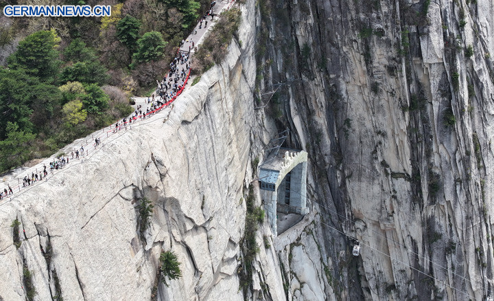 Die Luftaufnahme zeigt eine Seilbahn-Gondel bei der Abfahrt aus einer Seilbahnstation im malerischen Gebiet des Huashan-Gebirges, 29. April 2025. (Foto vom 29. April 2025, Xinhua/Zhang Bowen)