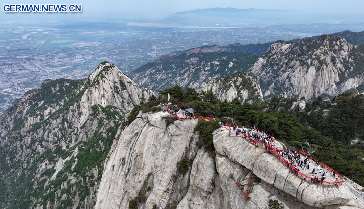 Die Luftaufnahme zeigt Touristen beim Besuch des malerischen Gebietes des Huashan-Gebirges, 29. April 2025. (Foto vom 29. April 2025, Xinhua/Zhang Bowen)
