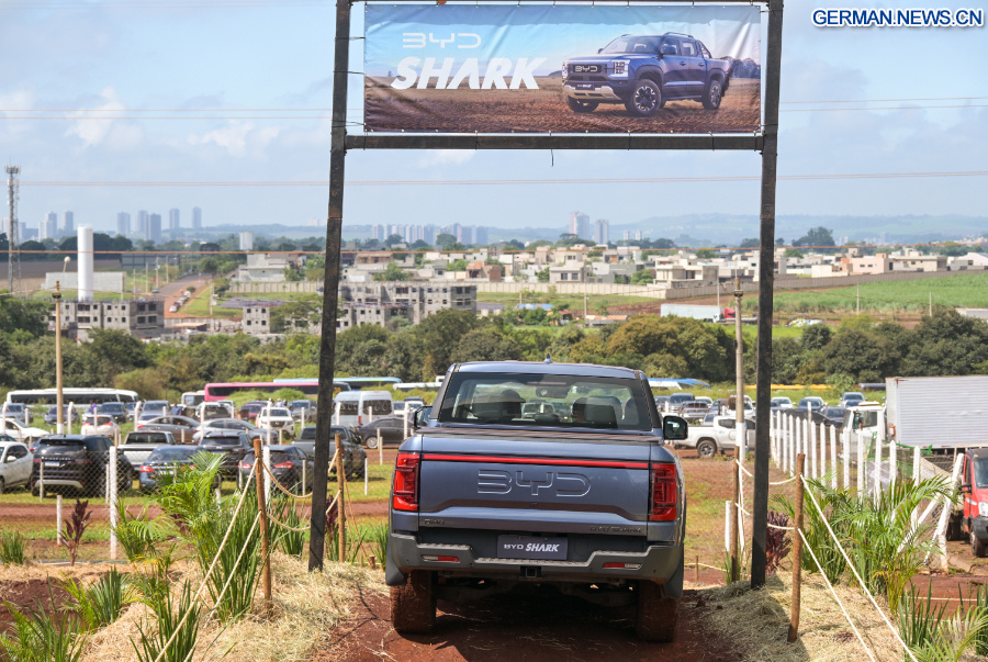 Ein Pick-up-Truck von BYD führt bei einer Agrartechnologie-Messe im brasilianischen São Paulo eine Offroad-Demonstration durch. (29. April 2023, Xinhua/Chen Haoquan)