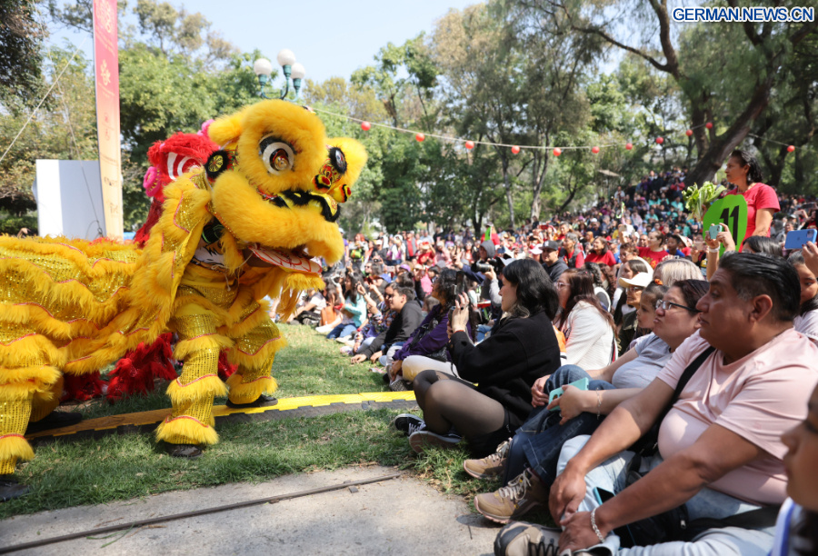Menschen beobachten eine Löwentanzvorführung bei der vierten Ausgabe des Kulturfestivals zum chinesischen Neujahr in der mexikanischen Hauptstadt Mexiko-Stadt, 25. Januar 2025. (Xinhua/Li Mengxin)