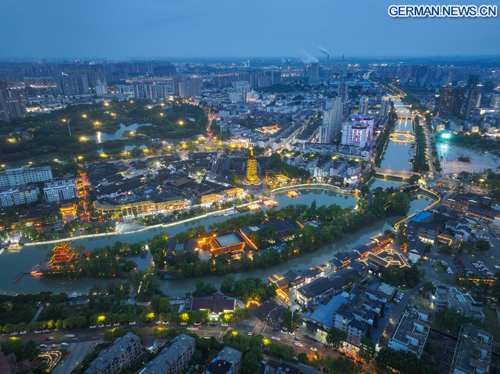 Die Luftaufnahme einer Drohne zeigt einen Abschnitt des Kulturkorridors in Huai'an in der Provinz Jiangsu in Ostchina, 10. Mai 2025. (Xinhua/Ji Chunpeng)