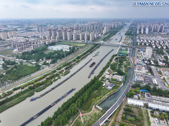 Die Luftaufnahme einer Drohne zeigt Schiffe auf dem Abschnitt des Großen Kanals in Huai'an in der Provinz Jiangsu in Ostchina, 10. Mai 2025. (Xinhua/Ji Chunpeng)