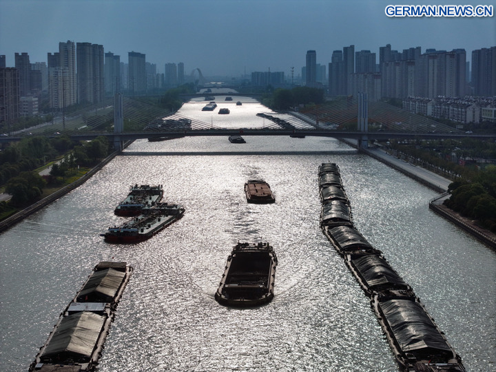 Die Luftaufnahme einer Drohne zeigt Schiffe auf dem Abschnitt des Großen Kanals in Huai'an in der Provinz Jiangsu in Ostchina, 10. Mai 2025. (Xinhua/Ji Chunpeng)