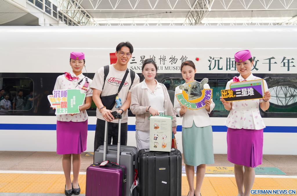 Der Touristenzug verließ Chengdu am Sonntag und markierte damit den Start des ersten Zuges, der thematisch an die legendären Sanxingdui-Ruinenstätten angelehnt ist.