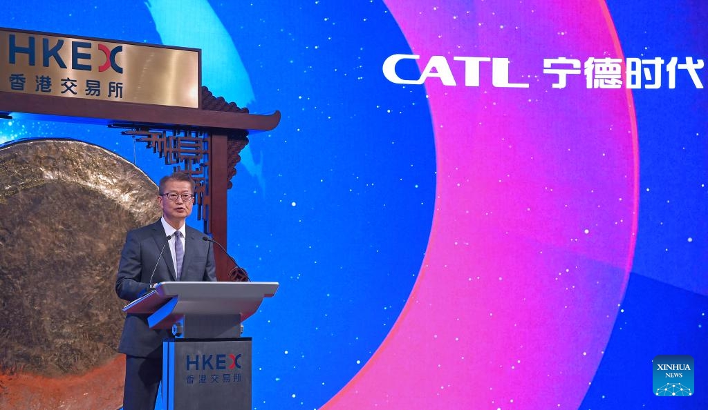 Paul Chan, Finanzsekretär der chinesischen Sonderverwaltungszone Hongkong, hielt eine Rede auf der Zeremonie für CATLs Börsengang. (20. Mai 2025, Xinhua)