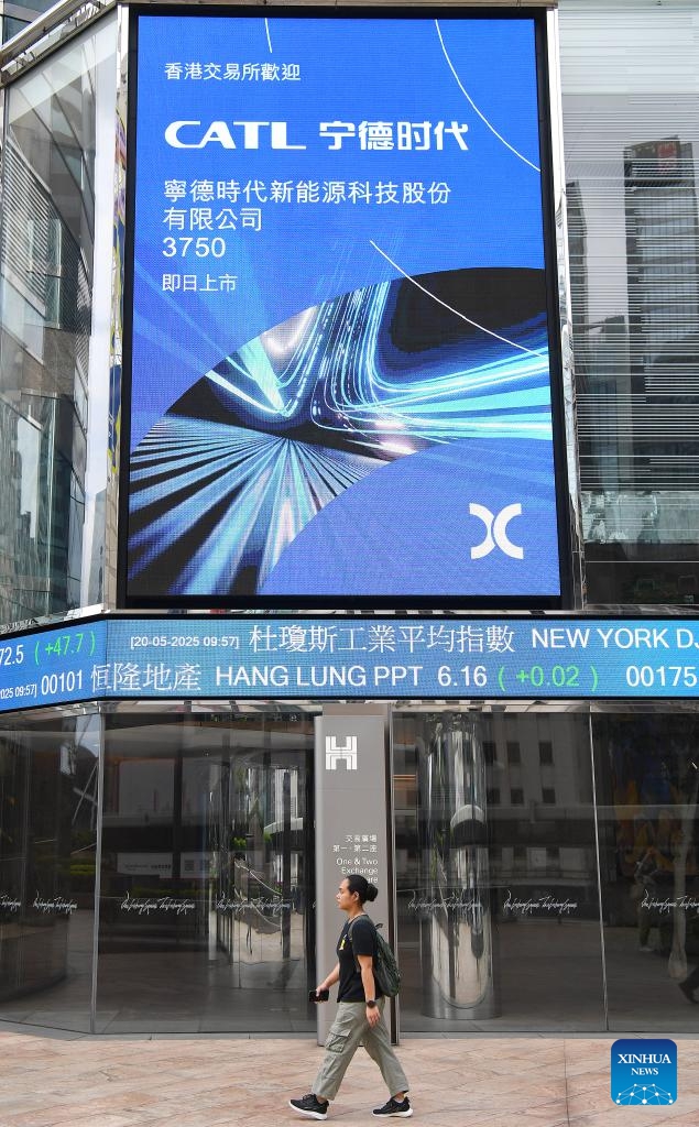 Das Foto zeigt ein CATL-Werbebanner an der Hongkonger Börse. (20. Mai 2025, Xinhua)