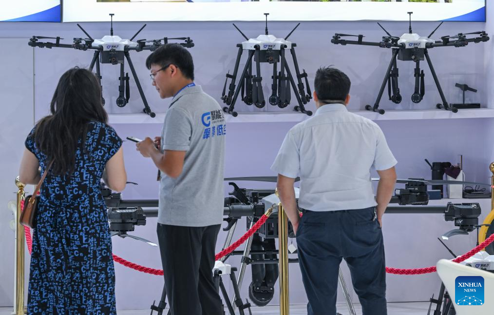 Menschen schauen sich Drohnen an. (22. Mai 2025, Xinhua)