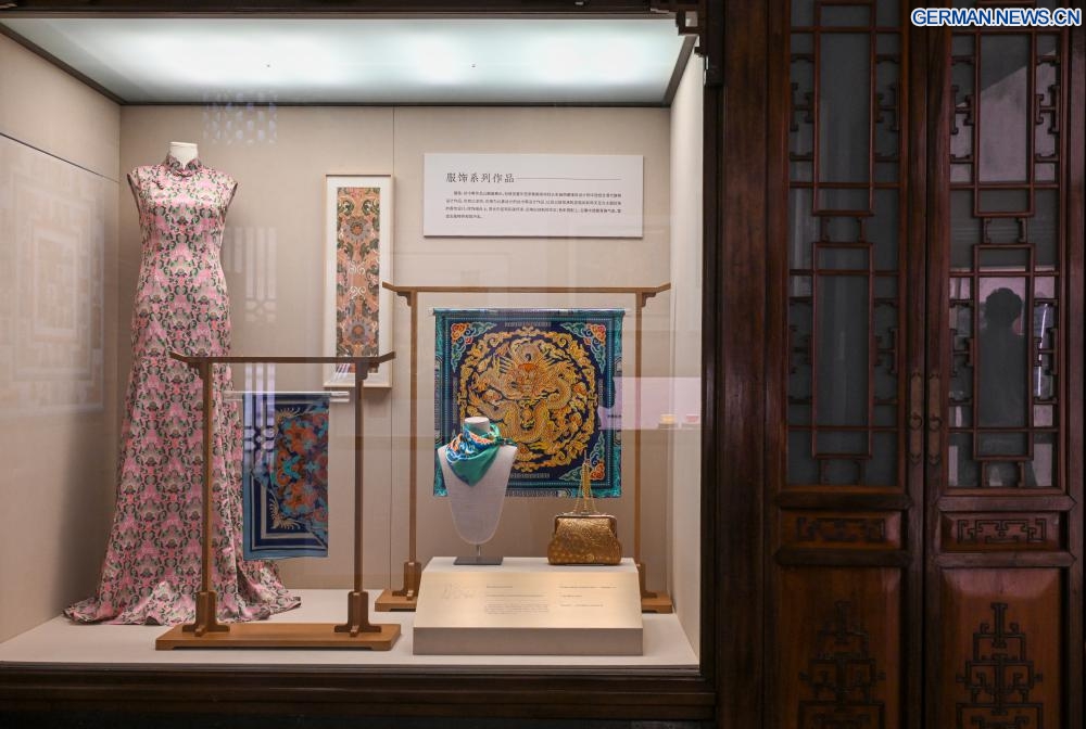 Entworfene Kleidung und Accessoires mit Caihua-Elementen sind während der Ausstellung „Ein Tausendjähriges Erbe von Caihua: Vererbung und Innovation in der chinesischen architektonischen Polychromie des offiziellen Stils“ im Palastmuseum in Chinas Hauptstadt Beijing zu sehen, 26. Mai 2025.