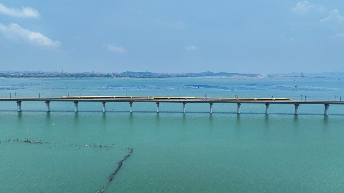 Ein CR450-Hochgeschwindigkeitszug fährt mit einer Geschwindigkeit von 453 km/h in der ostchinesischen Provinz Fujian. (28. Juni 2023, Xinhua)