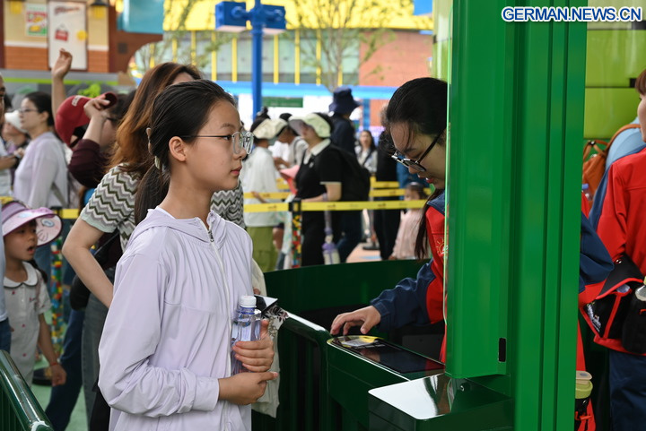Besucher erhalten Zugang mittels eines Gesichtserkennungsgeräts am Eingang zum LEGOLAND Shanghai Resort im ostchinesischen Shanghai, 31. Mai 2025. (Xinhua/Chen Aiping)