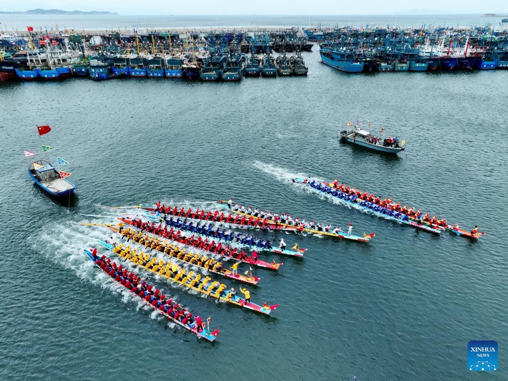 Ein Drachenbootrennen in einem Fischereihafen in Lianjiang in der südostchinesischen Provinz Fujian. (11. Juni 2024, Xinhua)