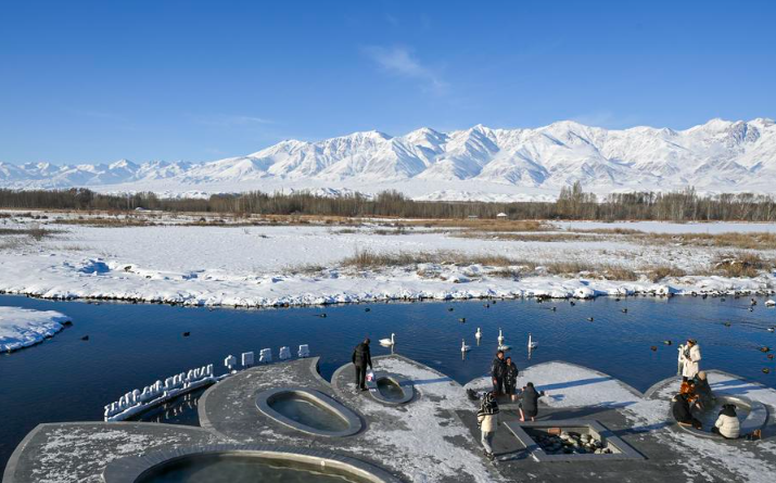 Touristen besuchen am 22. Dezember 2024 heiße Quellen im Bortala River National Wetland Park in der Mongolischen Autonomen Präfektur Bortala in der Uigurischen Autonomen Region Xinjiang im Nordwesten Chinas. (Xinhua/Chen Shuo)