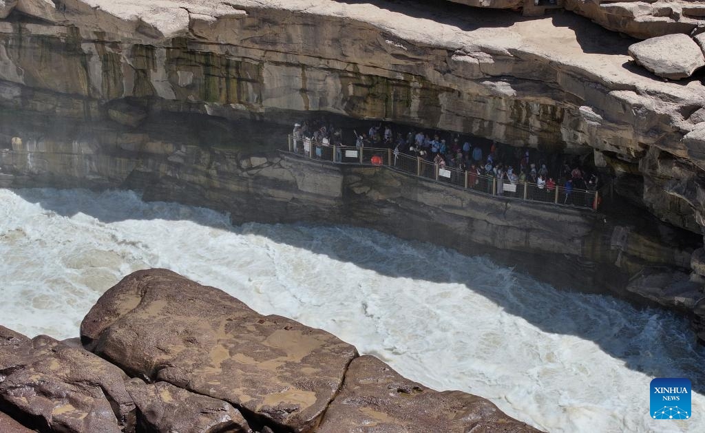 Touristen besuchen den Hukou-Wasserfall am Gelben Fluss an der Grenze zwischen der nordchinesischen Provinz Shanxi und der nordwestchinesischen Provinz Shaanxi. (4. Juni 2025, Xinhua)