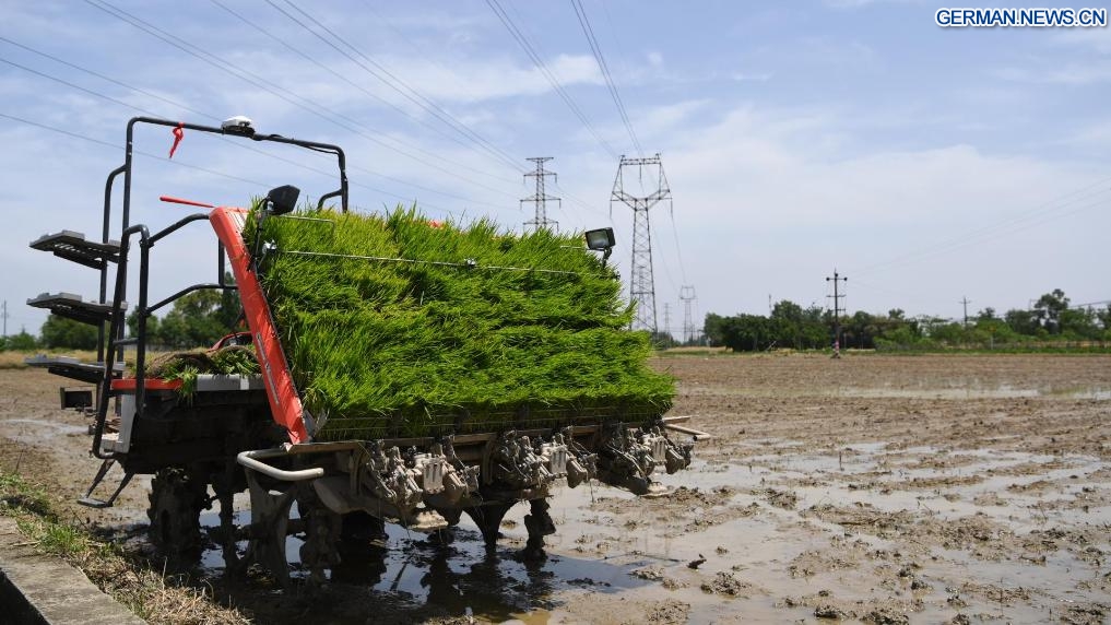 Das am 8. Mai 2025 aufgenommene Drohnenfoto zeigt eine intelligente, unbemannte 5G-Reispflanzmaschine bei der Arbeit in der zentralen Demonstrationszone „Tianfu-Getreidespeicher“ in Chongzhou in der südwestchinesischen Provinz Sichuan. Bei einem Wettbewerb für intelligente Landwirtschaft, der vom 15. Mai bis zum 30. September stattfindet, treten sechs menschliche Landwirtschaftsteams gegen vier KI-unterstützte Gruppen auf 1.000 Mu (oder 66,7 Hektar) erstklassigem Ackerland in Sichuan an. Dieser moderne Wettstreit zwischen Tradition und Technologie bietet einen Einblick in Chinas Streben nach intelligenter Landwirtschaft. (Quelle: Xinhua)