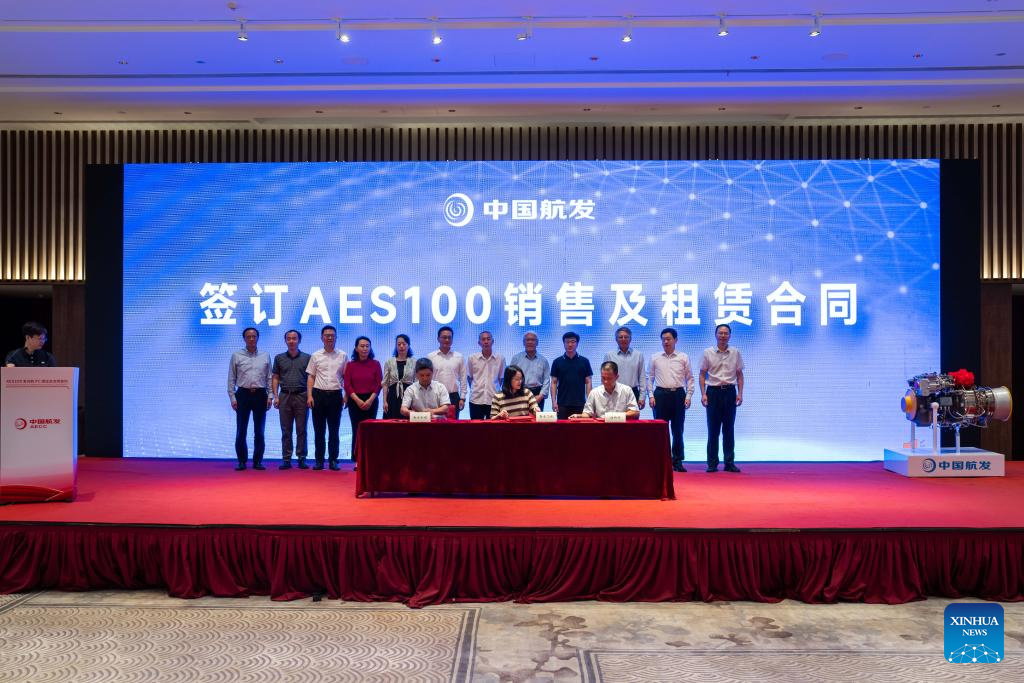 Teilnehmer unterzeichnen Verträge über den Verkauf und die Vermietung des AES100-Triebwerks während der Überprüfungssitzung zur Entwicklung des Triebwerks in Zhuzhou. (Foto vom 5. Juni 2025, Xinhua/Chen Sihan)
