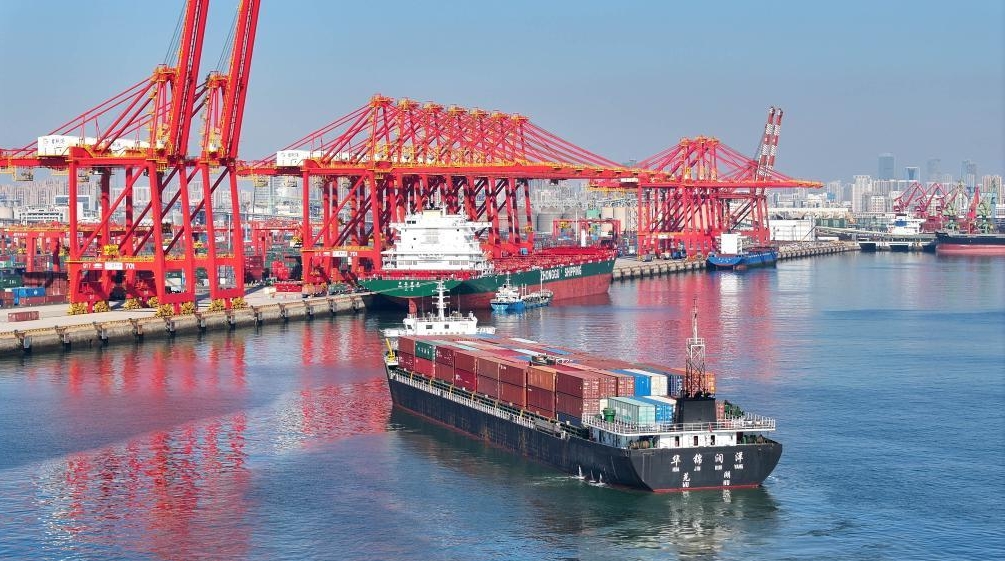 Am Containerterminal im Hafen von Rizhao, Provinz Shandong, legt ein Frachtschiff zum Be- und Entladen an. (10. Januar 2024, Xinhua)