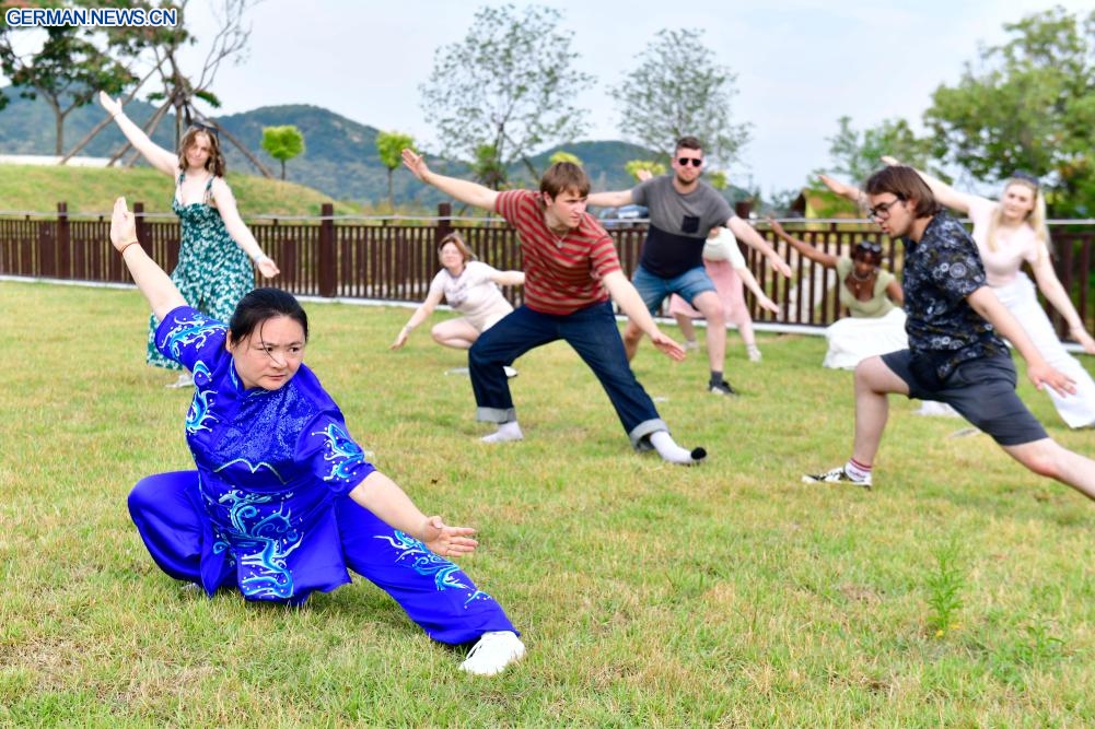 Studierende aus der Leeds Beckett University lernen Kampfsport von einer chinesischen Lehrerin an einer Trainingsbasis im Kreis Wulian in der Stadt Rizhao in der ostchinesischen Provinz Shandong, 10. Juni 2025. Die Fakultäten und Studierenden aus der Leeds Beckett University in Großbritannien und der Fachhochschule Rizhao in Shandong veranstalteten ein Austauschcamp in Rizhao, wo die Teilnehmer Videoclips drehten und traditionelle chinesische Kultur wie Kampfsport und Batik erlebten. Die beiden Institutionen veranstalten nun gemeinsam ein professionelles Ausbildungsprogramm zum Thema digitales Medienkunstdesign. (Quelle: Xinhua/Guo Xulei)