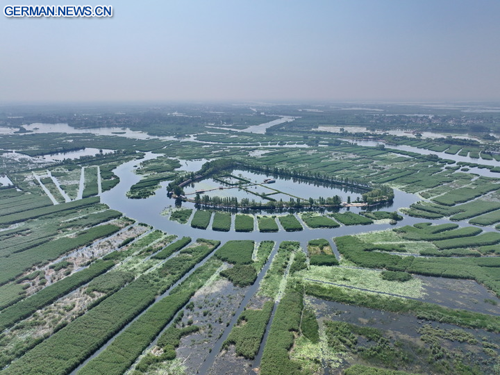 Die Luftaufnahme einer Drohne zeigt einen Blick auf den Baiyangdian-See in der Xiongan New Area der nordchinesischen Provinz Hebei, 11. Juni 2025. Seit der Gründung der Xiongan New Area hat sich die Wasserqualität des Baiyangdian-Sees dank der systematischen ökologischen Maßnahmen stark verbessert. (Xinhua/Mu Yu)