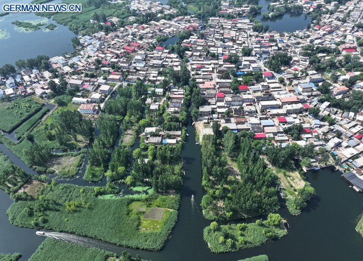 Die Luftaufnahme einer Drohne zeigt Dörfer der Baiyangdian Area in der Xiongan New Area der nordchinesischen Provinz Hebei, 11. Juni 2025. (Xinhua/Mu Yu)