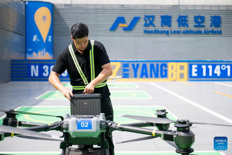 Auf dem Hanshang-Flugplatz für niedrige Flughöhen wechselt ein Mitarbeiter die Batterie einer Drohne. (Xinhua/Wu Zhizun)