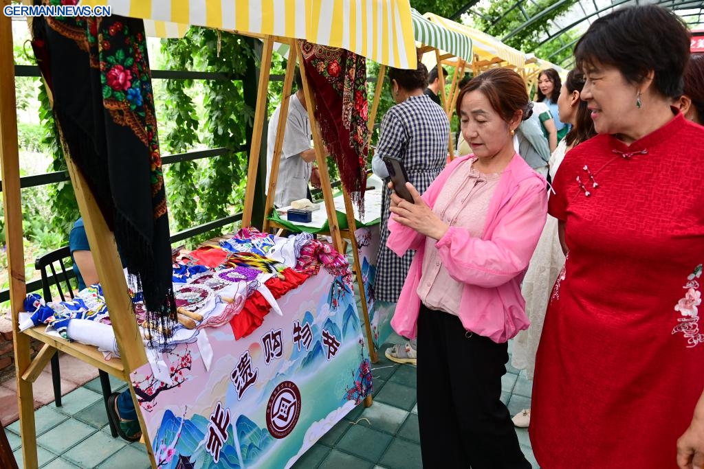 Touristen besuchen einen Markt für immaterielles Kulturerbe im Kreis Huocheng im nordwestchinesischen Uigurischen Autonomen Gebiet Xinjiang, 14. Juni 2025. (Quelle: Xinhua/Ding Lei)
