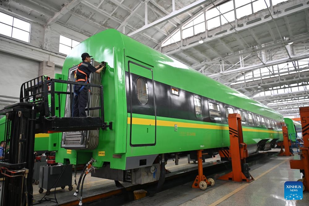 Technikerpersonal prüft einen Zug in der nordchinesischen Stadt Taiyuan. (17. Juni 2025, Xinhua)