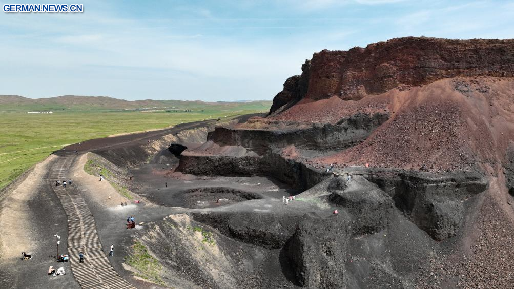 Die Luftaufnahme einer Drohne vom 17. Juni 2025 zeigt Touristen, die die Ulanhada-Vulkancluster im Qahar Right Wing Rear Banner in Ulanqab im nordchinesischen Autonomen Gebiet Innere Mongolei besuchen. Die Ulanhada-Vulkancluster zeichnet sich durch besondere geologische Landschaften wie Vulkane und Lavalandschaften aus. Mit der Ankunft des Sommers hat die touristische Hochsaison begonnen. (Quelle: Xinhua/Bei He)