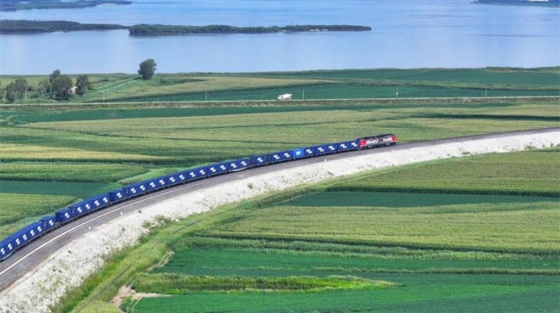 Einer der China-Europa-Güterzüge bei der Abfahrt vom nördlichen Eisenbahnhafen Tongjiang in der nordostchinesischen Provinz Heilongjiang am 9. August 2024. (Xinhua)