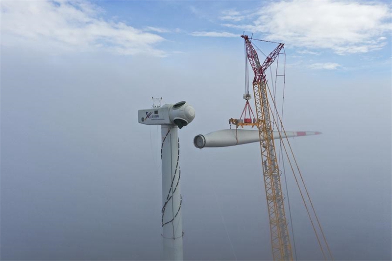Das am 27. September 2020 aufgenommene Foto zeigt den Hebevorgang auf der Baustelle des 156-Megawatt-Windparks Senj in Kroatien. (Ding Decai/Xinhua)