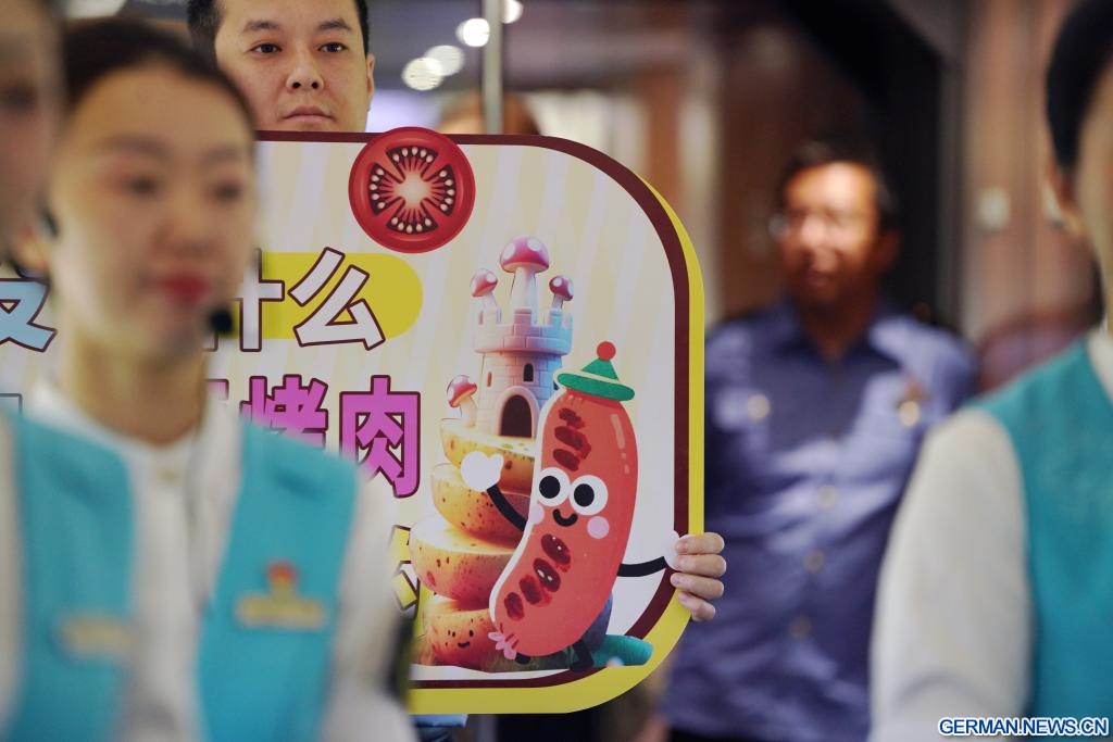 Ein Zugbegleiter zeigt im Zug D6993 in der nordostchinesischen Provinz Heilongjiang eine Karikatur von Qiqihar-Barbecue, 18. Juni 2025. (Quelle: Xinhua/Wang Song)
