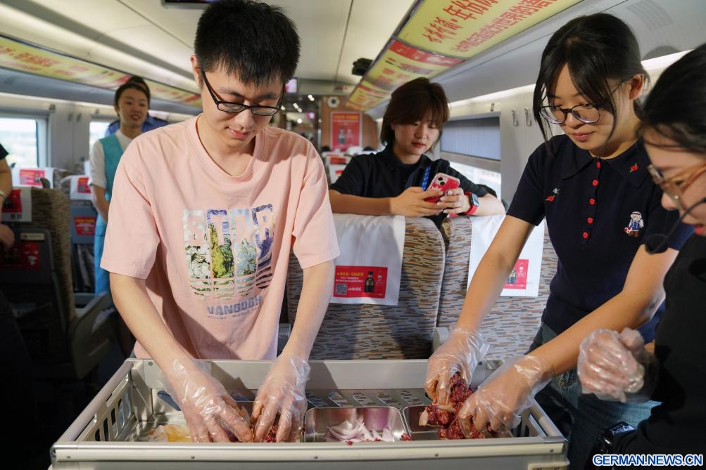 Ein Passagier (links) versucht im Zug D6993 in der nordostchinesischen Provinz Heilongjiang die Zubereitung von Qiqihar-Barbecue, 18. Juni 2025. (Quelle: Xinhua/Wang Song)